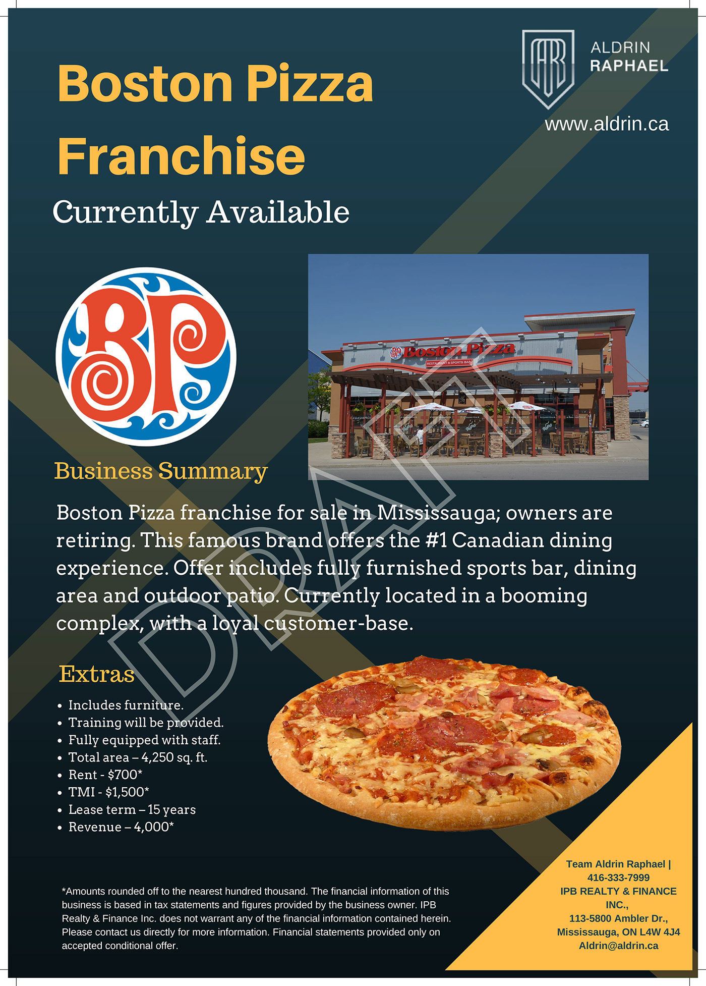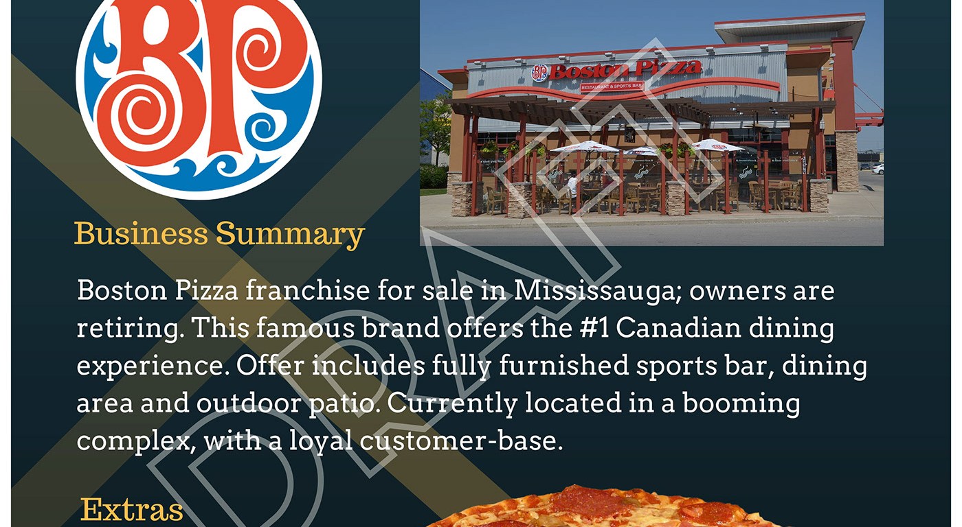 This teaser was created for Team Aldrin Rapheal, a real-estate group in the Mississauga area. This flyer promotes the sale of a Boston Pizza franchise.