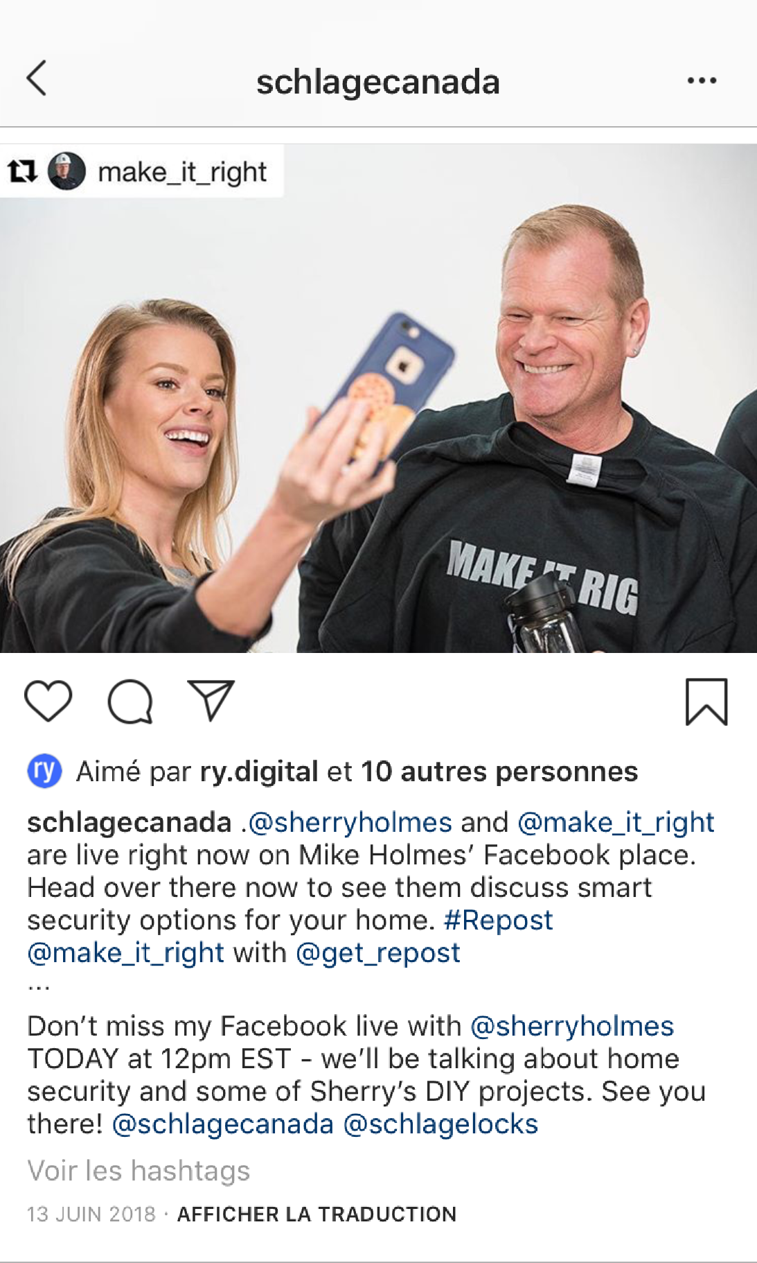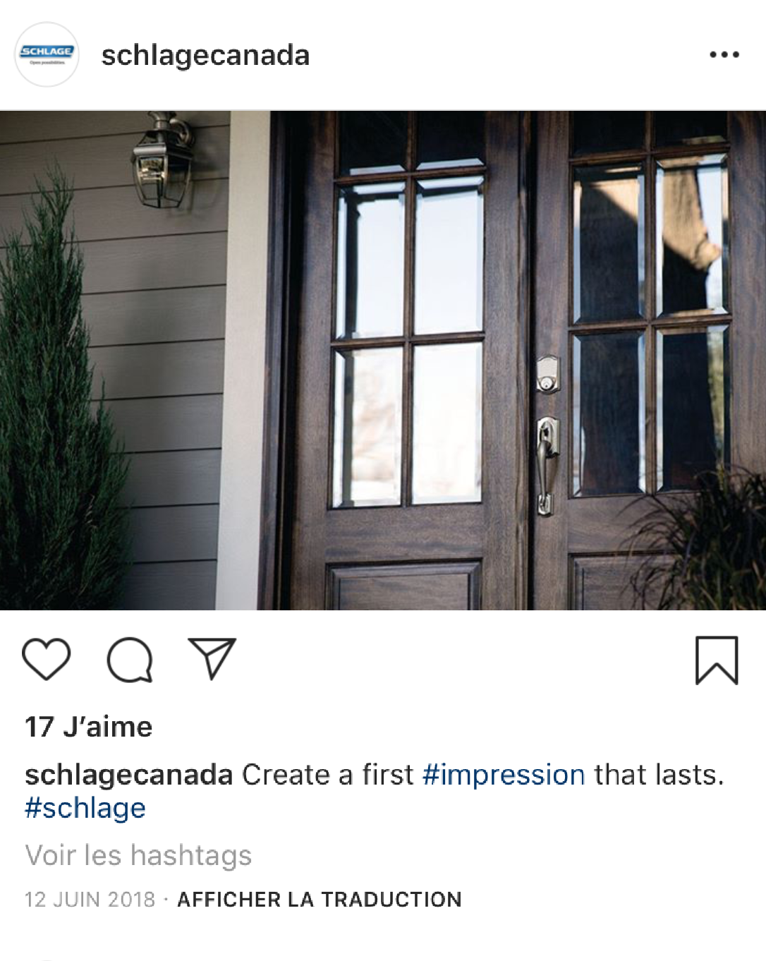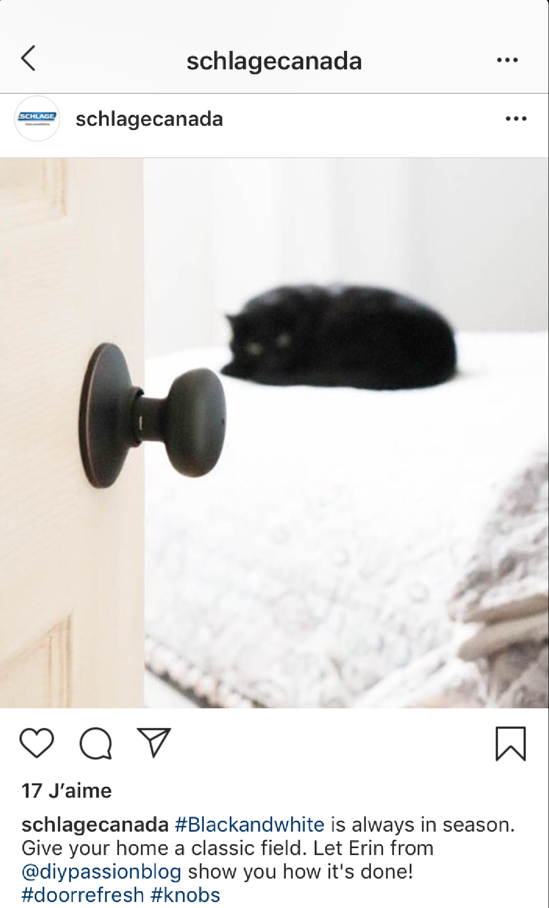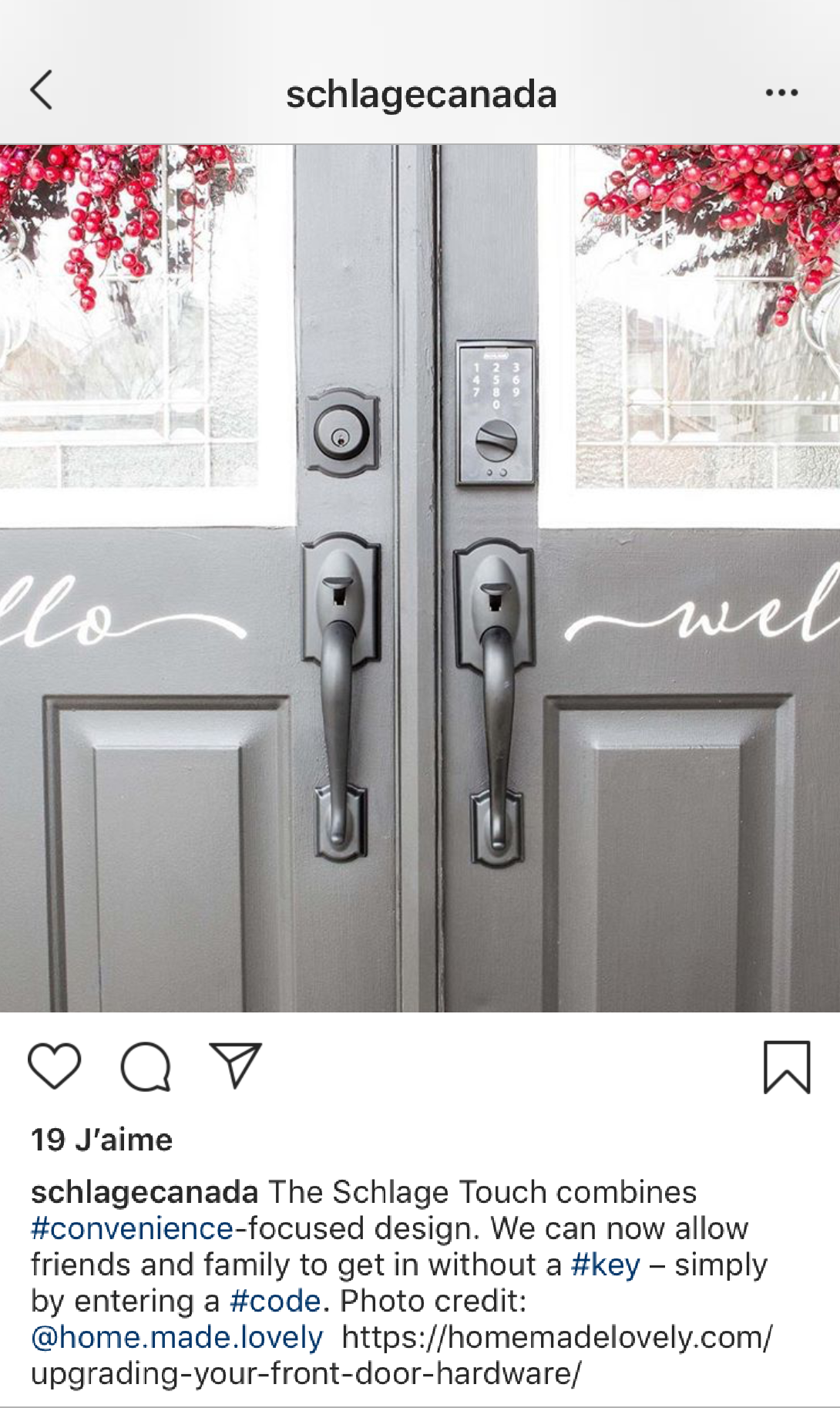 During my time as Community Manager at Allegion Canada, I managed their residential and commercial social media channels. Below, you will see examples of posts I created or reposted on the Schlage Canada Instagram account. (Schlage Canada is the name of Allegion Canada’s residential brand.) Some of these posts included partnership posts with Mike Holmes’ Make It Right brand, general promotional posts for our residential brands and sponsored posts with home decor bloggers like Home Made Lovely and DIY passion.