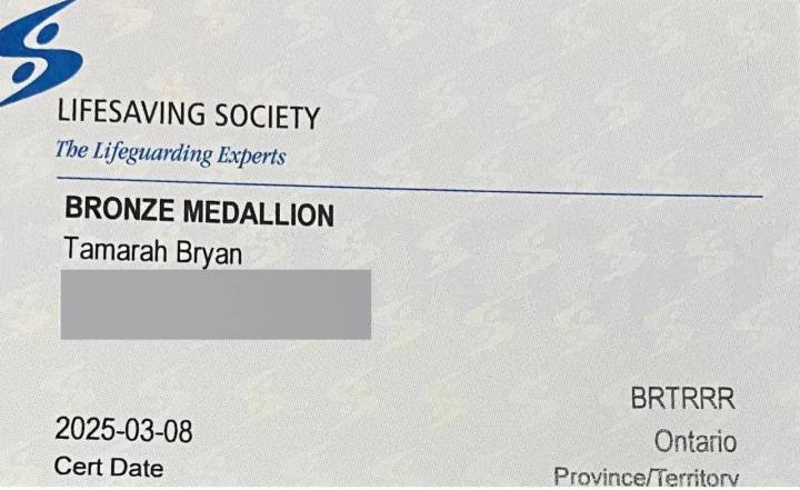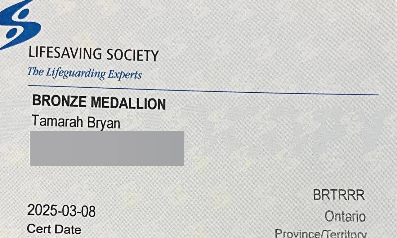 When speaking with staff members at the community centre, I was encouraged to take classes more advanced than the adult swim programs. When speaking with friends, they suggested pursuing lifeguard certification. The first course in my journey was the Bronze Medallion. This class taught me so much, and helped me to sharpen my skills, and learn Emergency First Aid (CPR B) techniques. It took two tries, as I needed to take my fitness to the next level, but I appreciate every step of the journey. Many thanks to my instructors, community centre staff, and classmates for the enriching experience.